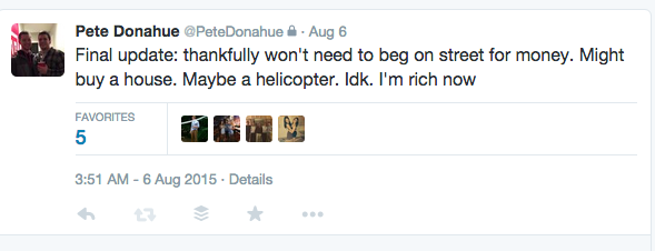 Pete told me he didn’t have much money to his name after working a minimum wage internship this summer, but somehow he managed to find enough money to play table games. From his Twitter account it sounds as if it started badly.